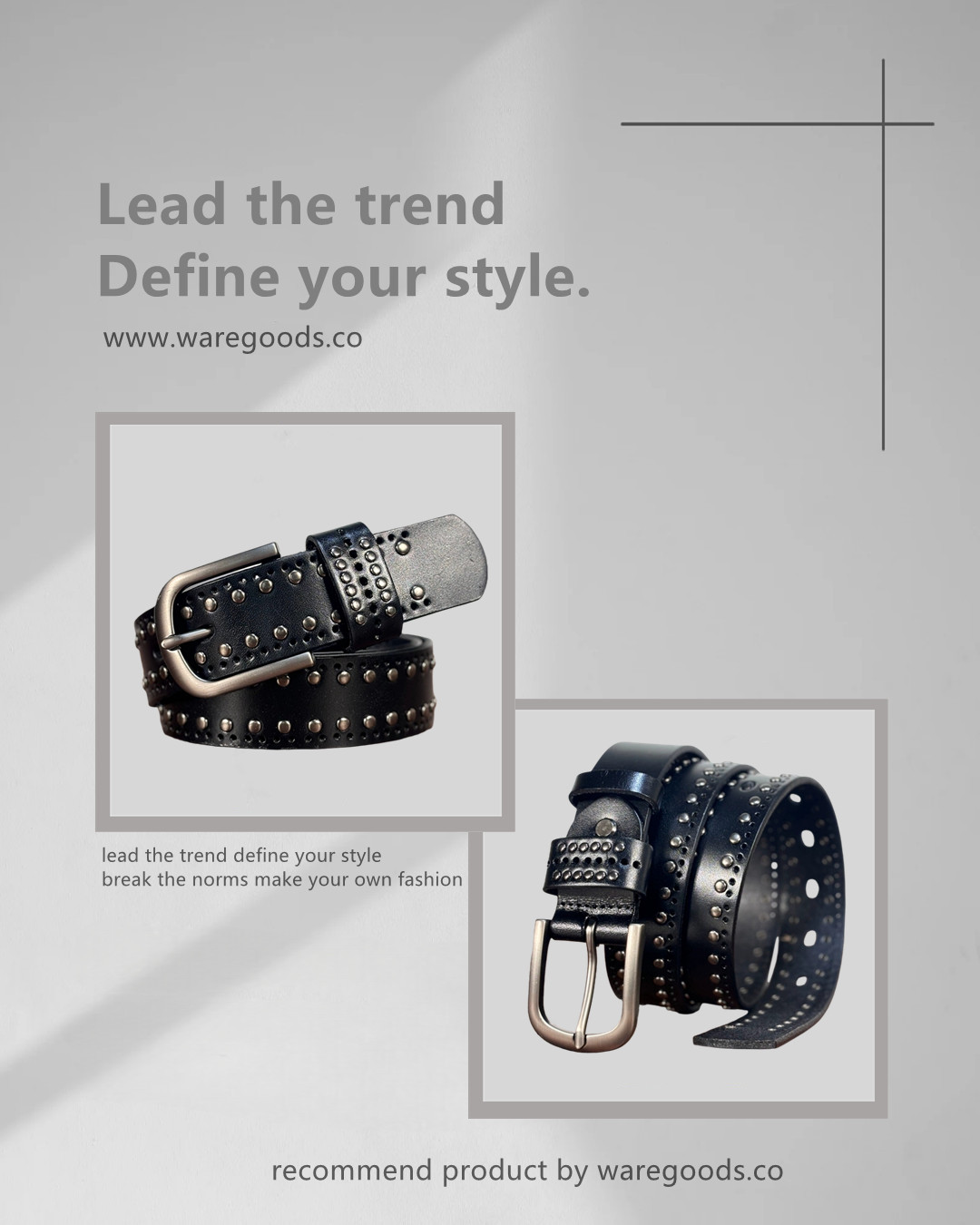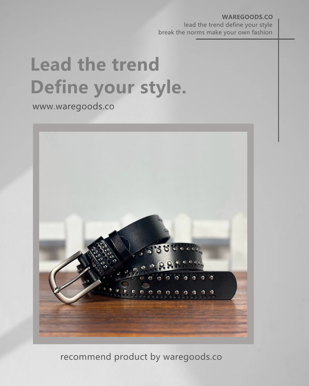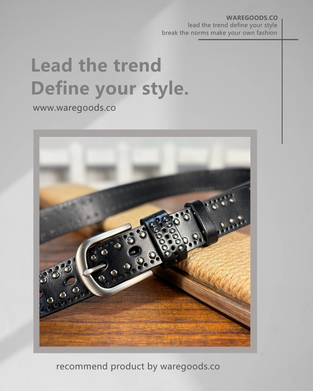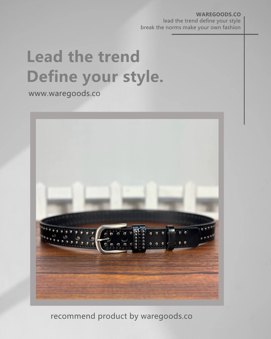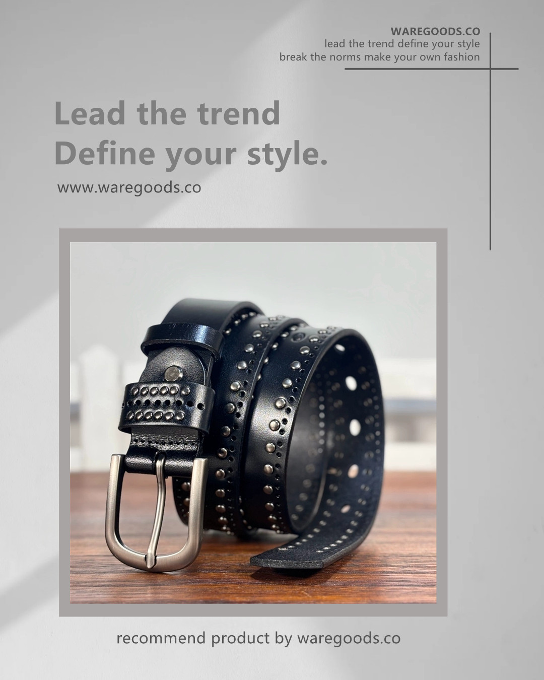 🔸復古鉚釘銀釦牛皮皮帶 –皮帶長度: 90cm ~ 110cm –帶身闊度:3.3 cm –90cm 適合腰圍25-26吋 (69cm以下) –95cm 適合腰圍27-28吋 (70-74cm以下) –100cm 適合腰圍29-30吋 (75-79cm以下) –105cm 適合腰圍31-32吋 (80-84cm以下) –110cm 適合腰圍32-33吋 (85-89cm以下) –帶身長度不含銀釦 –帶身物料:頭層牛皮 –銀釦物料:鋅合金 –color: 黑色 –unisex By WAREGOODS (1)(FB)(IG) waregoods.co (2)Whatsapp +852 56491196 https://www.waregoods.co/ *凡購物滿以上金額免運費* 香港消費滿HKD 500 澳門消費滿HKD 800 台灣消費滿 NT 5000